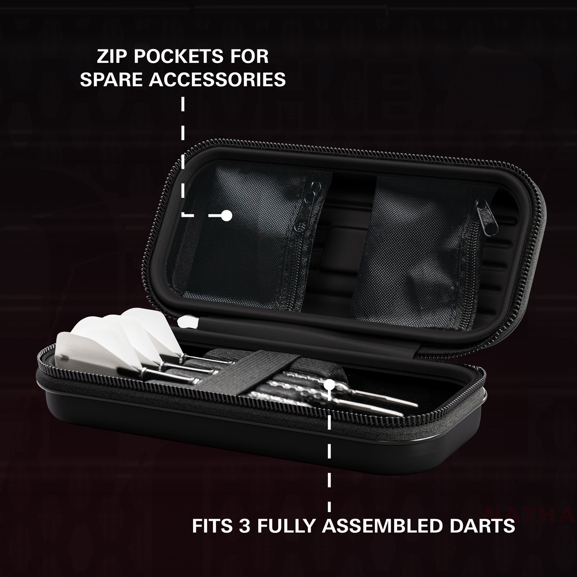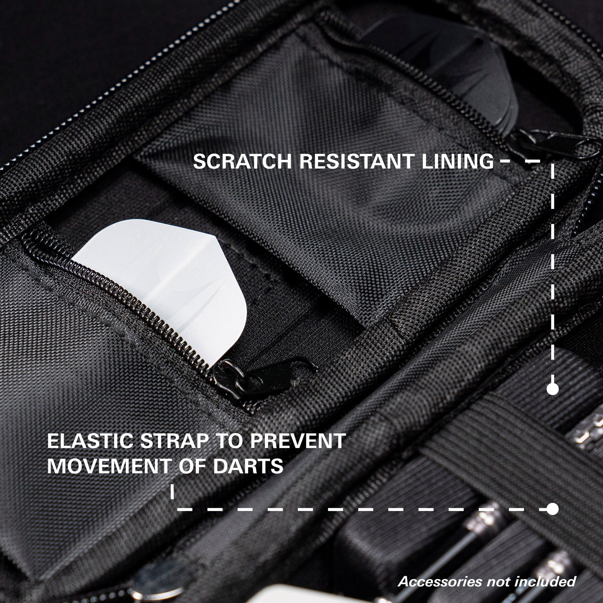 The scratch-resistant interior holds 3 fully assembled darts in place, while dedicated zip compartments offer room for spare flights, shafts, Swiss Points, or your Swiss Point tool — combining performance, practicality, and signature Littler style in one premium case.